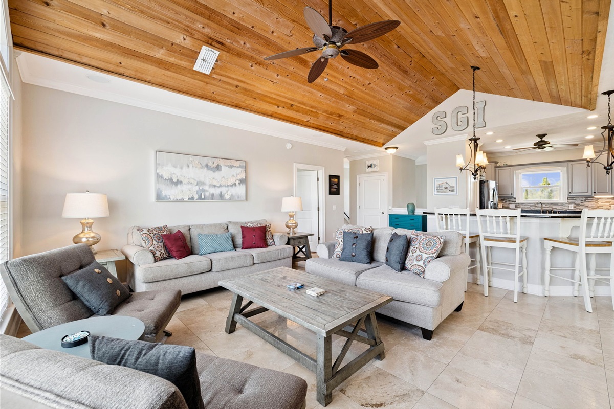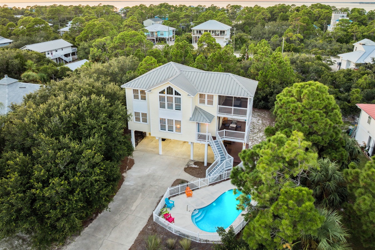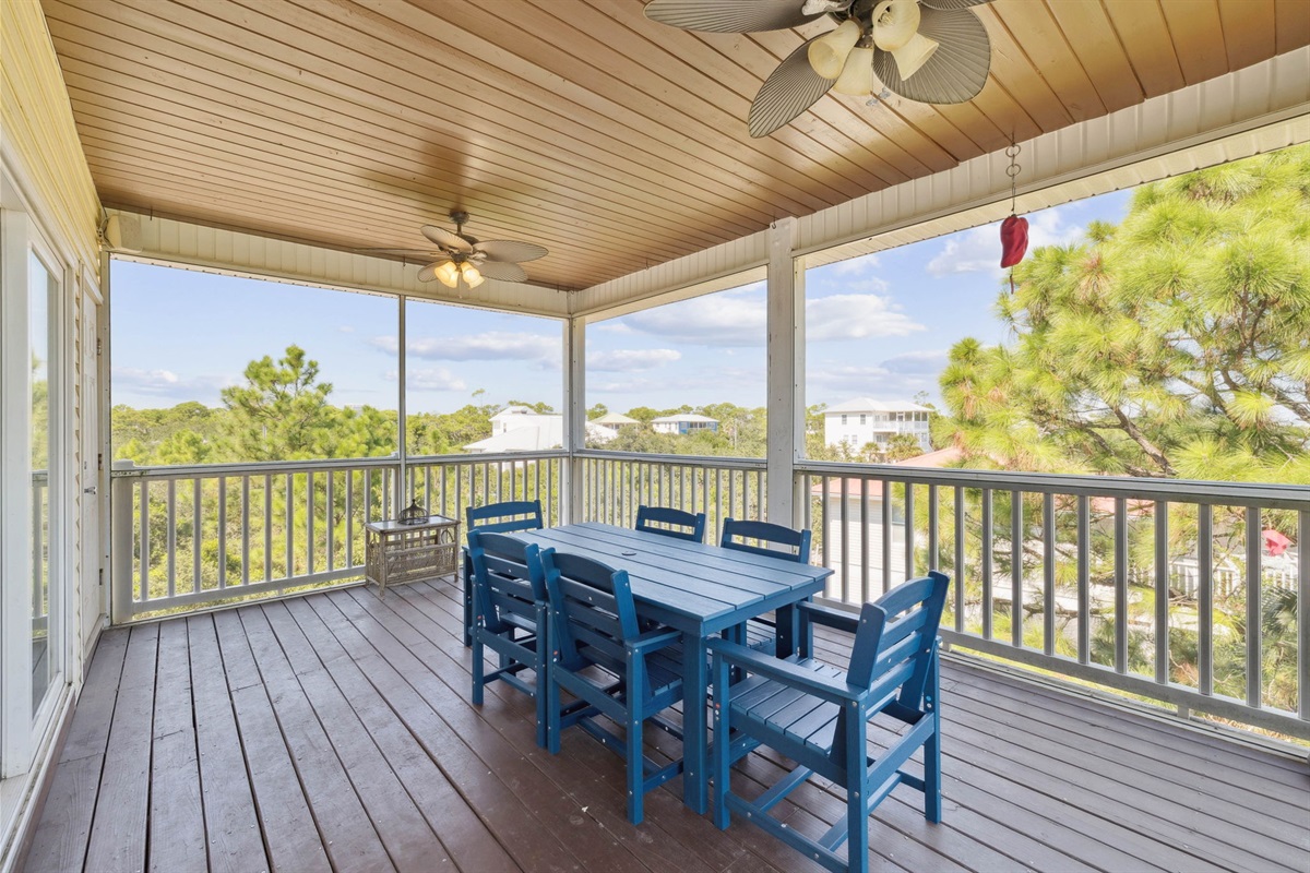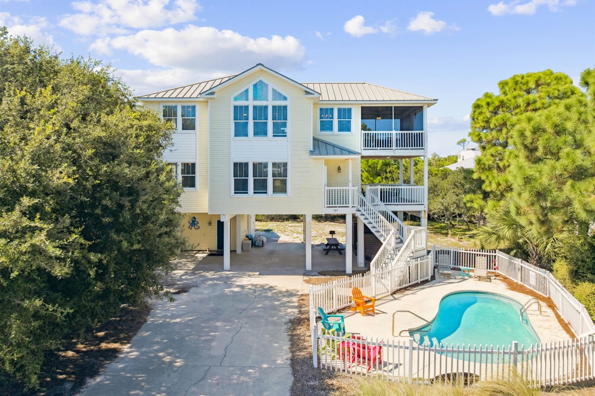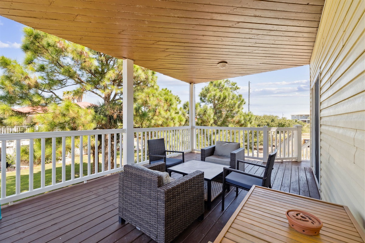 4 Bedrooms • 4 Bathrooms (3 full, 1 half) 4 Baths (3 full, 1 half) • Sleeps 10-12Enjoy all the Gulf has to offer at our spacious home on Saint George Island. Less than 300 steps is all it takes to lounge on the sand and frolic in the surf. The top floor great room features a vaulted ceiling and large windows to enjoy gulf views. The living area features a 55” flat screen TV and abundant comfortable seating, perfect for family gatherings. The fully equipped kitchen makes meal prep easy, the dining table seats eight and the large kitchen counter seats five. A large screened-in porch off the dining space is ideal for watching the gulf and has dining available for seven. There is one of two principal bedrooms on this floor with gorgeous gulf views, TV, king bed and en suite bathroom and shower. There is convenient half bath at the top of the stairs