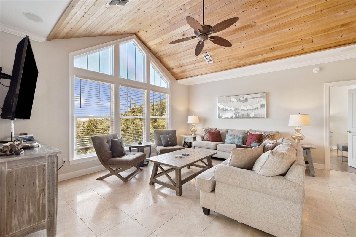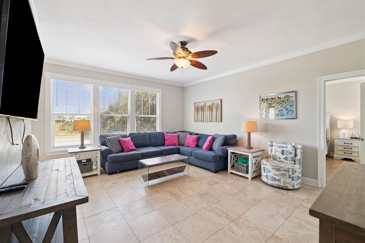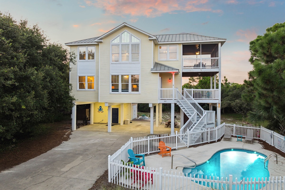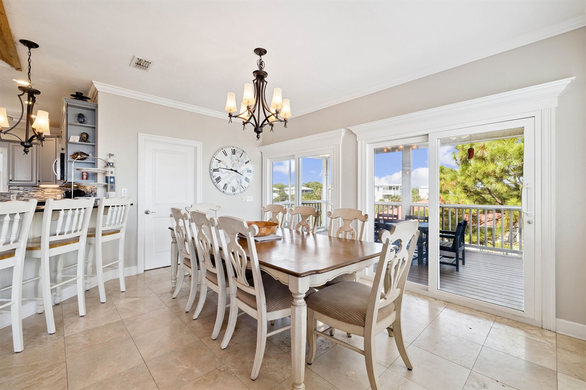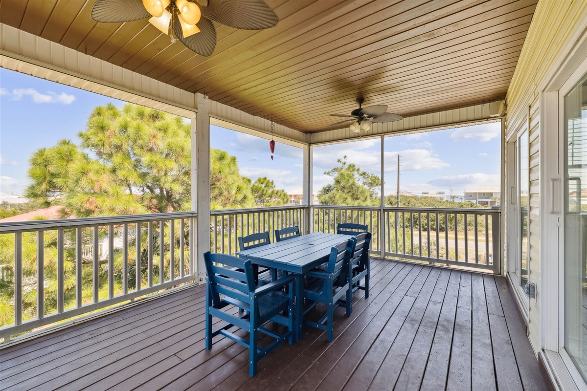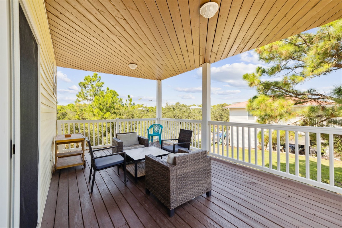 4 Bedrooms • 4 Bathrooms (3 full, 1 half) 4 Baths (3 full, 1 half) • Sleeps 10-12Enjoy all the Gulf has to offer at our spacious home on Saint George Island. Less than 300 steps is all it takes to lounge on the sand and frolic in the surf. The top floor great room features a vaulted ceiling and large windows to enjoy gulf views. The living area features a 55” flat screen TV and abundant comfortable seating, perfect for family gatherings. The fully equipped kitchen makes meal prep easy, the dining table seats eight and the large kitchen counter seats five. A large screened-in porch off the dining space is ideal for watching the gulf and has dining available for seven. There is one of two principal bedrooms on this floor with gorgeous gulf views, TV, king bed and en suite bathroom and shower. There is convenient half bath at the top of the stairs