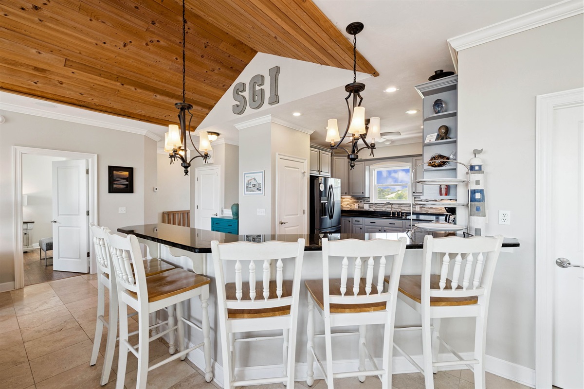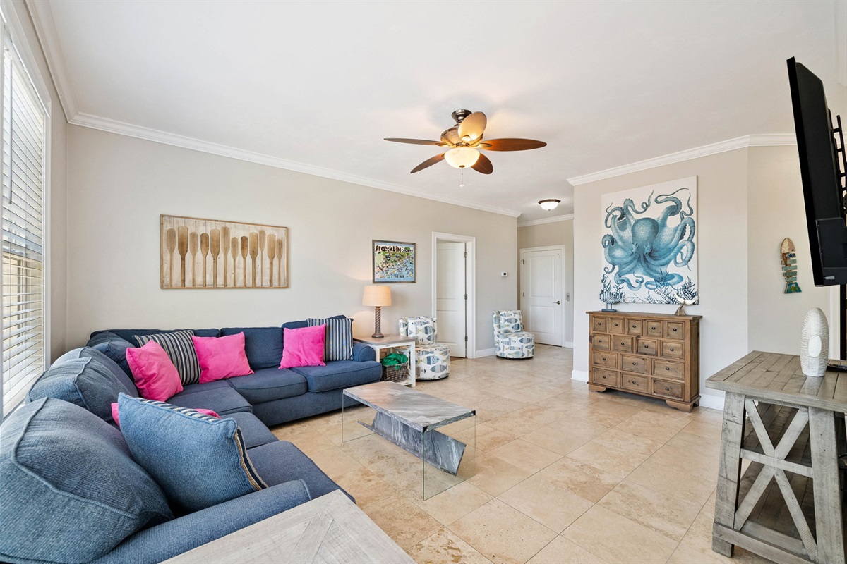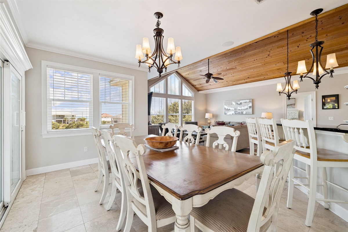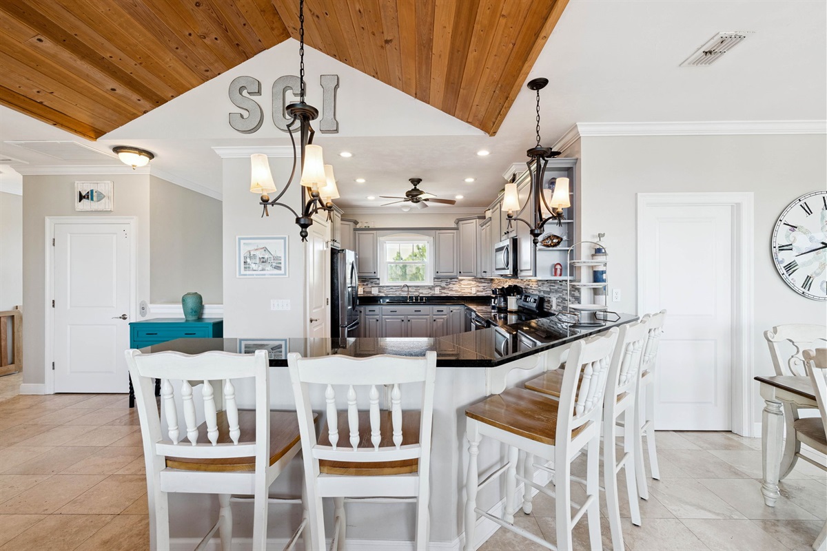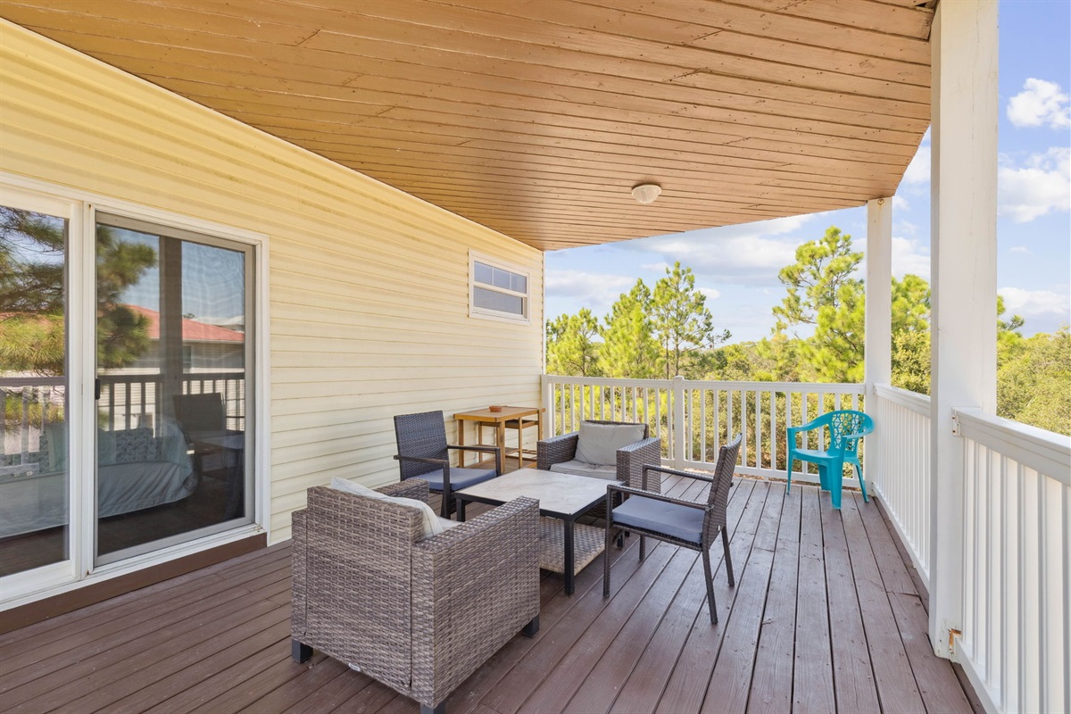 4 Bedrooms • 4 Bathrooms (3 full, 1 half) 4 Baths (3 full, 1 half) • Sleeps 10-12Enjoy all the Gulf has to offer at our spacious home on Saint George Island. Less than 300 steps is all it takes to lounge on the sand and frolic in the surf. The top floor great room features a vaulted ceiling and large windows to enjoy gulf views. The living area features a 55” flat screen TV and abundant comfortable seating, perfect for family gatherings. The fully equipped kitchen makes meal prep easy, the dining table seats eight and the large kitchen counter seats five. A large screened-in porch off the dining space is ideal for watching the gulf and has dining available for seven. There is one of two principal bedrooms on this floor with gorgeous gulf views, TV, king bed and en suite bathroom and shower. There is convenient half bath at the top of the stairs