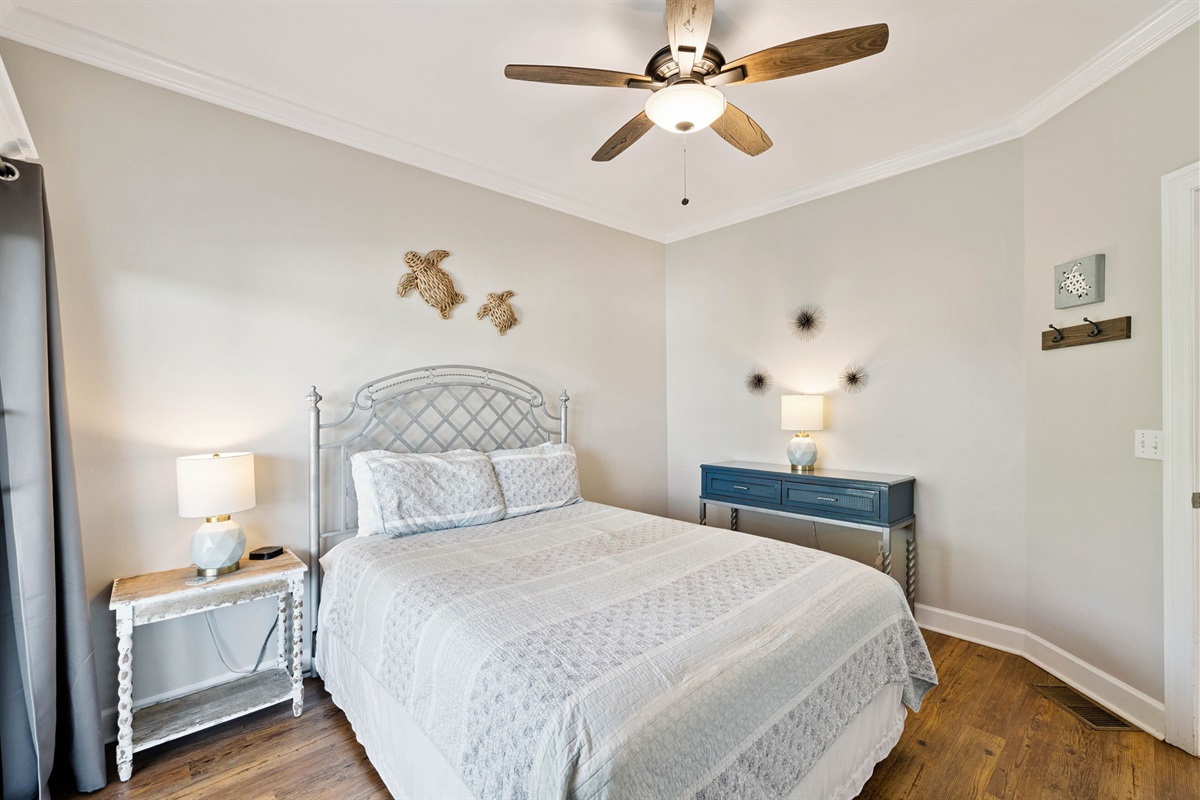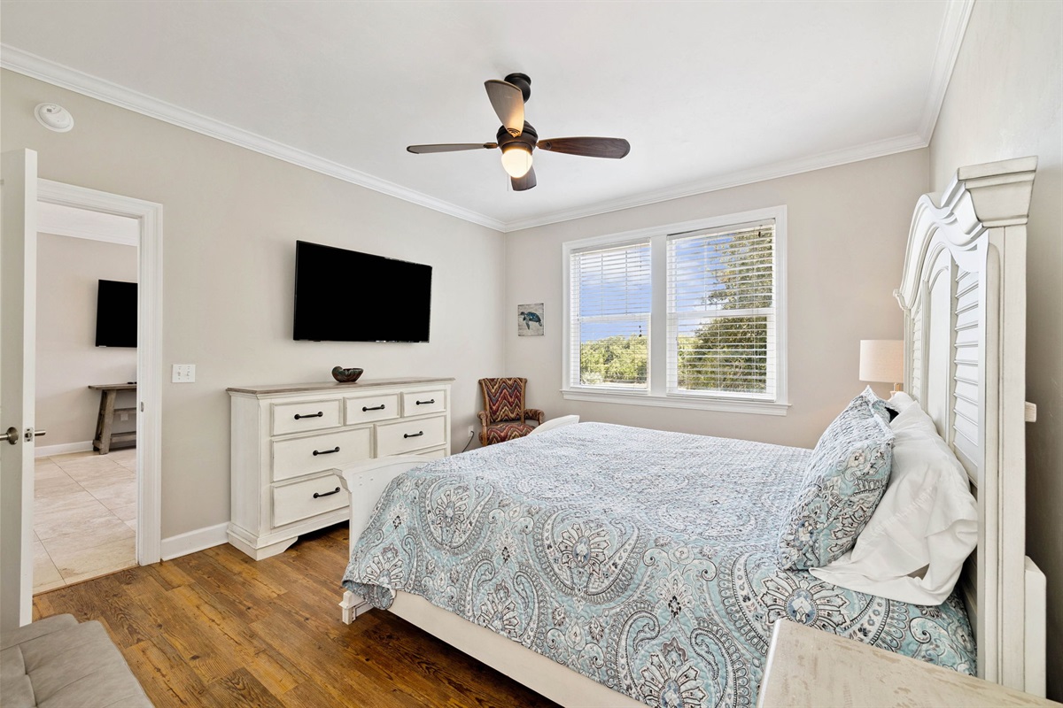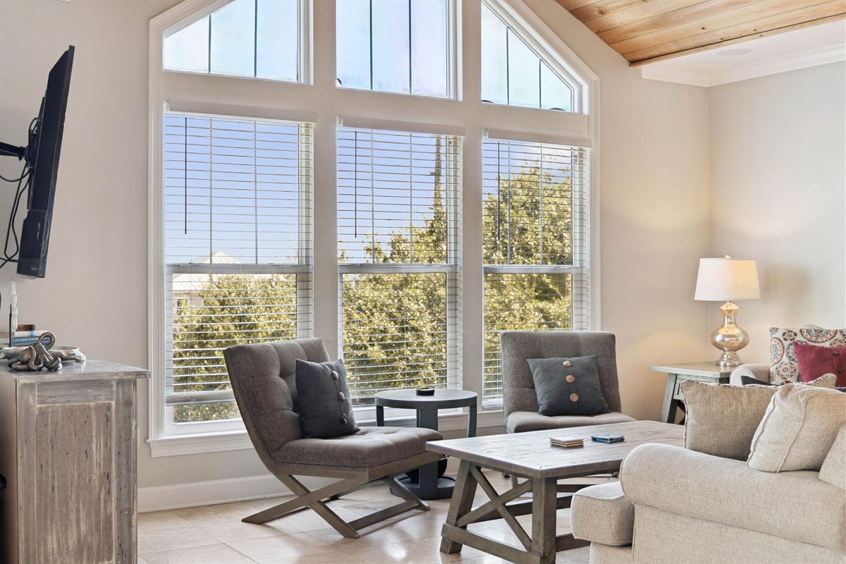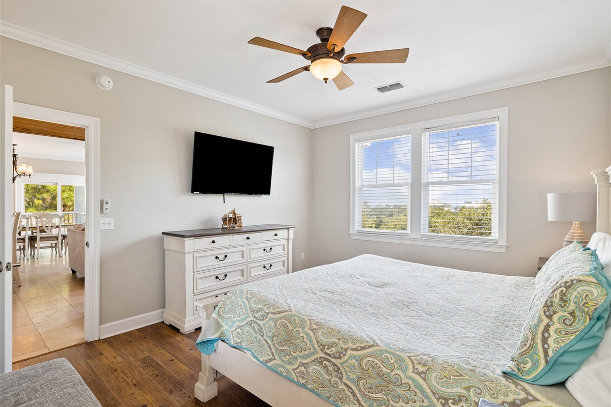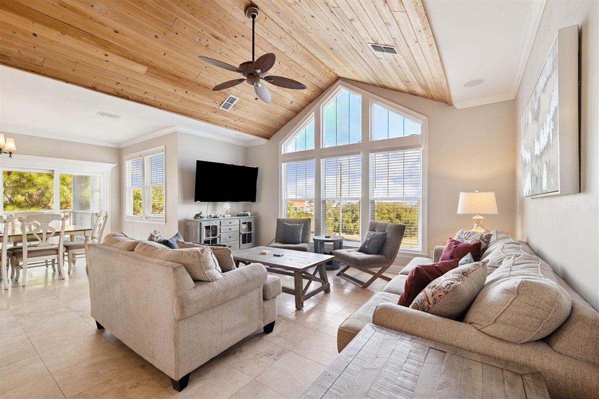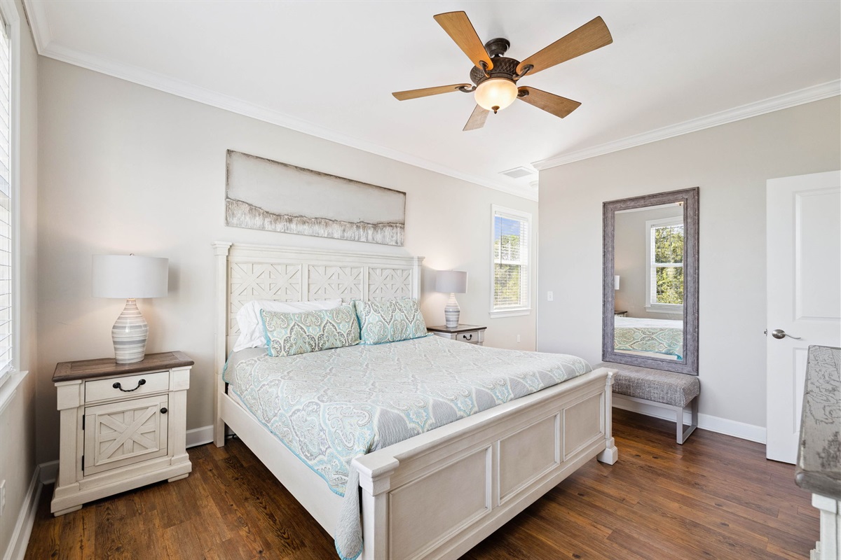 4 Bedrooms • 4 Bathrooms (3 full, 1 half) 4 Baths (3 full, 1 half) • Sleeps 10-12Enjoy all the Gulf has to offer at our spacious home on Saint George Island. Less than 300 steps is all it takes to lounge on the sand and frolic in the surf. The top floor great room features a vaulted ceiling and large windows to enjoy gulf views. The living area features a 55” flat screen TV and abundant comfortable seating, perfect for family gatherings. The fully equipped kitchen makes meal prep easy, the dining table seats eight and the large kitchen counter seats five. A large screened-in porch off the dining space is ideal for watching the gulf and has dining available for seven. There is one of two principal bedrooms on this floor with gorgeous gulf views, TV, king bed and en suite bathroom and shower. There is convenient half bath at the top of the stairs