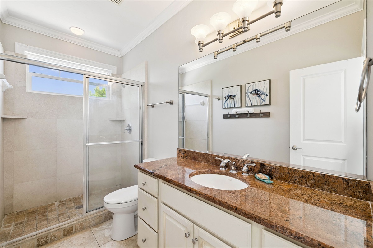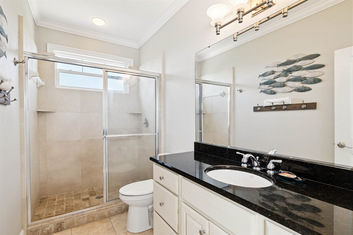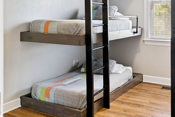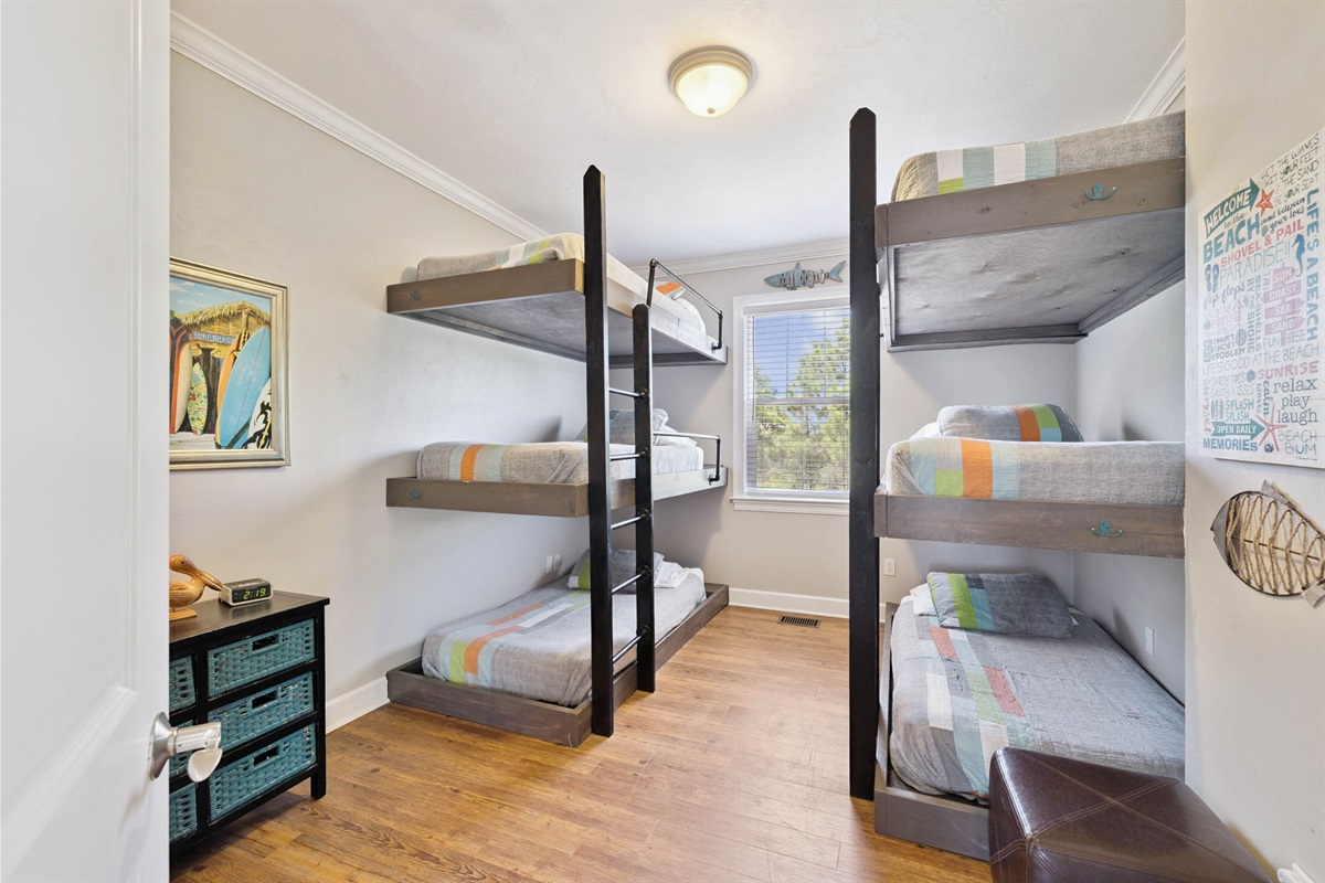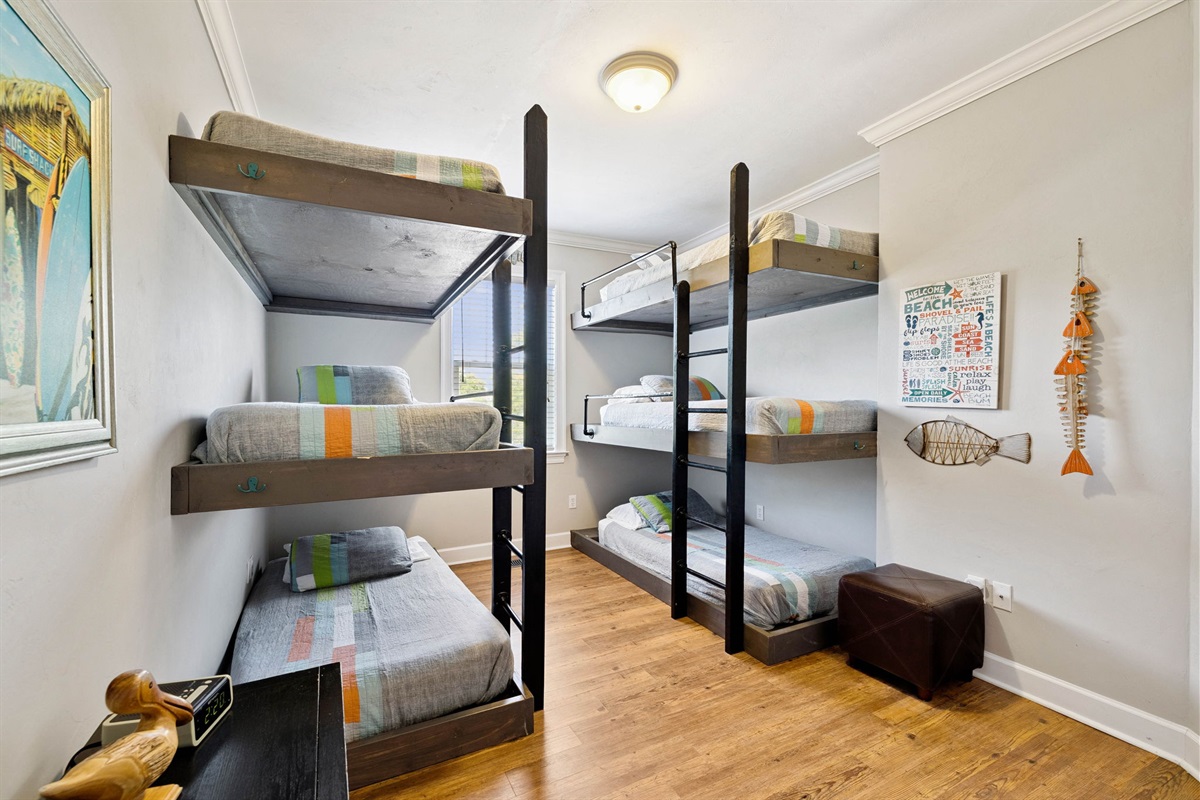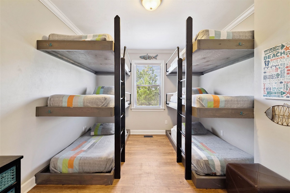 Take the elevator down to the first floor where there is a bonus entertainment area with a large screen TV and lots of comfy sofas. Perfect for the kids to entertain themselves when the grownups are upstairs. The second principal bedroom is on this floor with identical ammenities as the one on the second floor. The queen bedroom has a TV and a slider onto the first floor deck and the bunk room has two triple bunks. The queen and bunk rooms share a bathroom with a large shower.