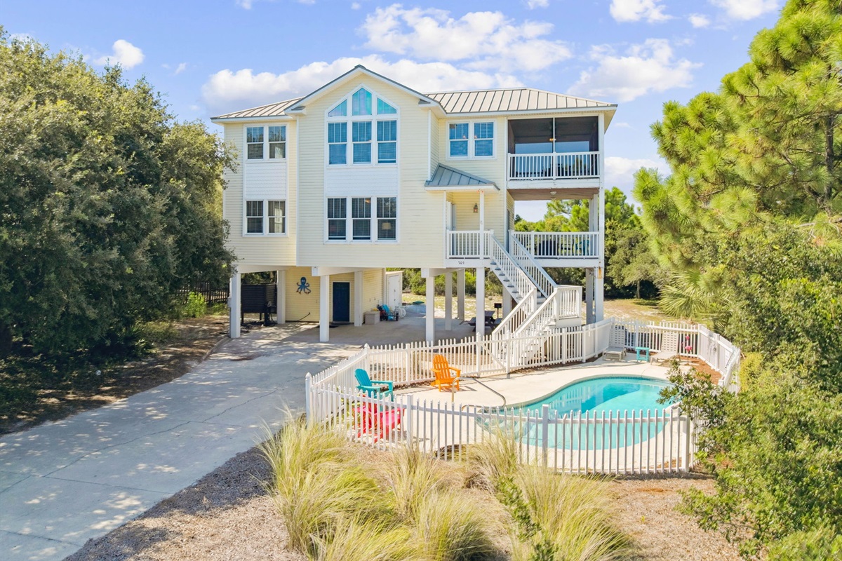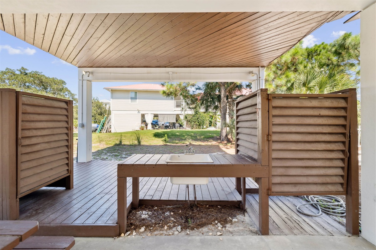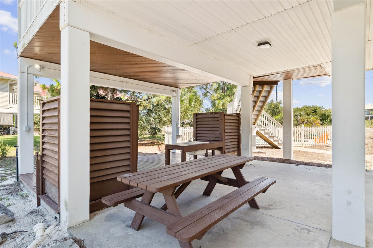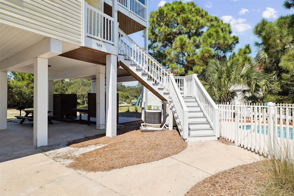 Outdoors on the ground level there is under house concrete parking, heated swimming pool, picnic table, park style grill, fire pit, enclosed outdoor shower, enclosed commode and fish cleaning station.