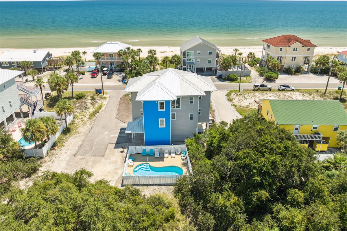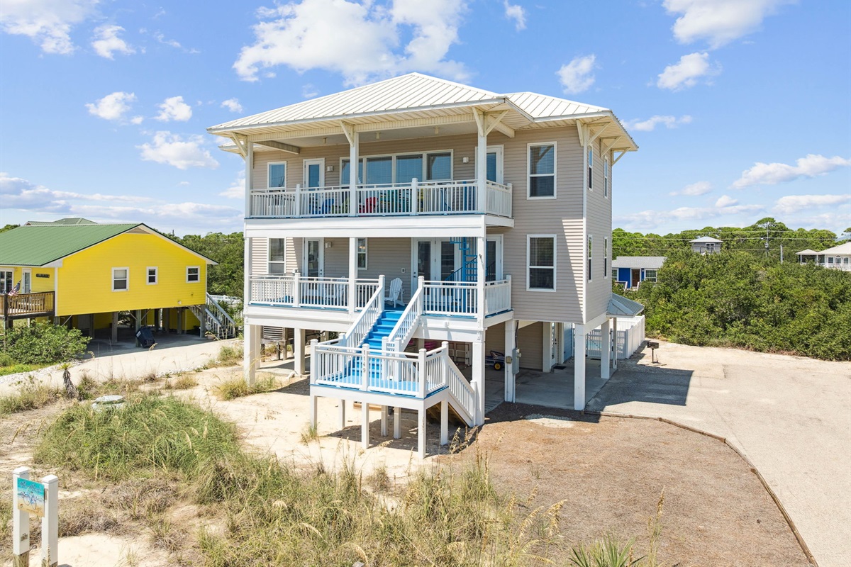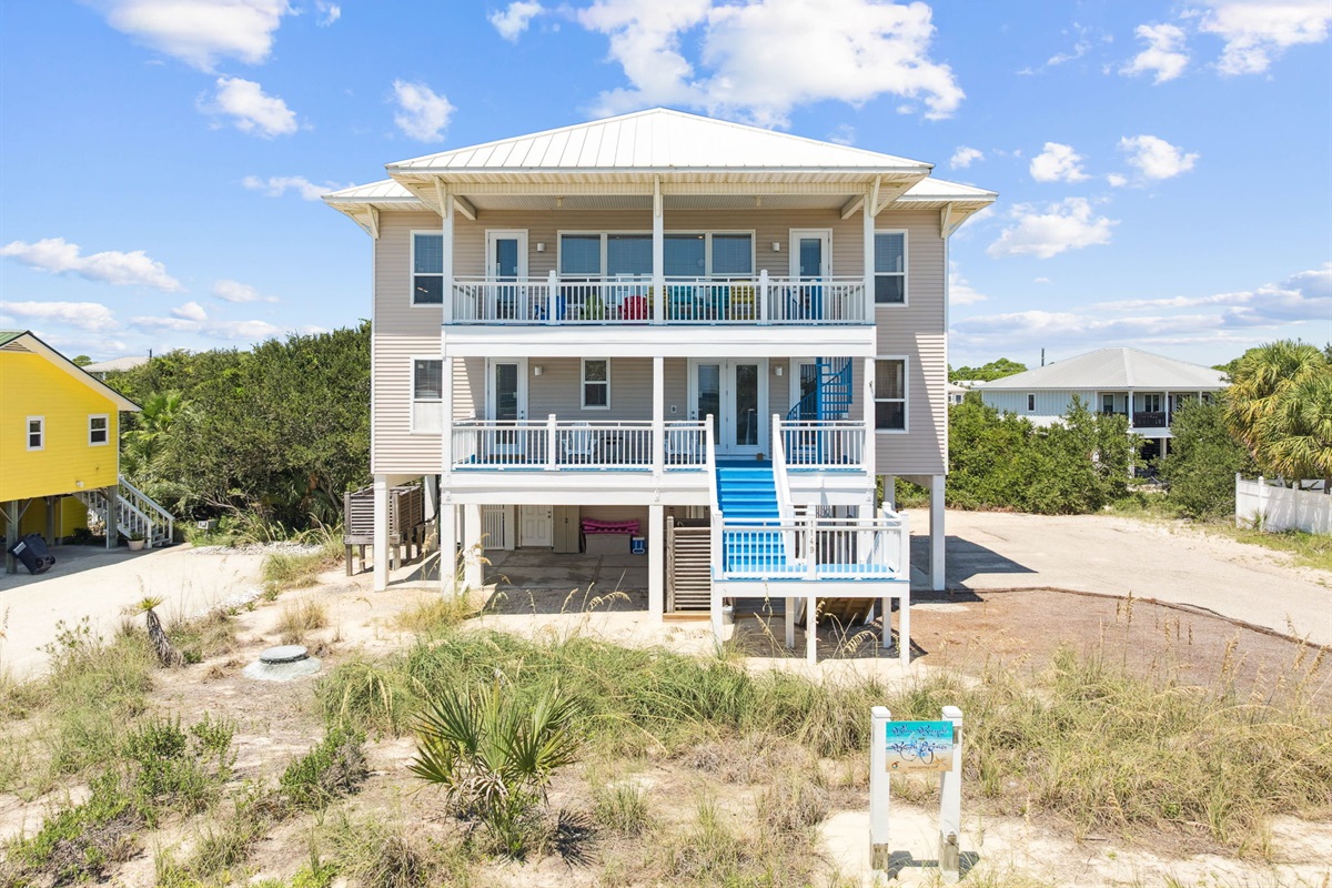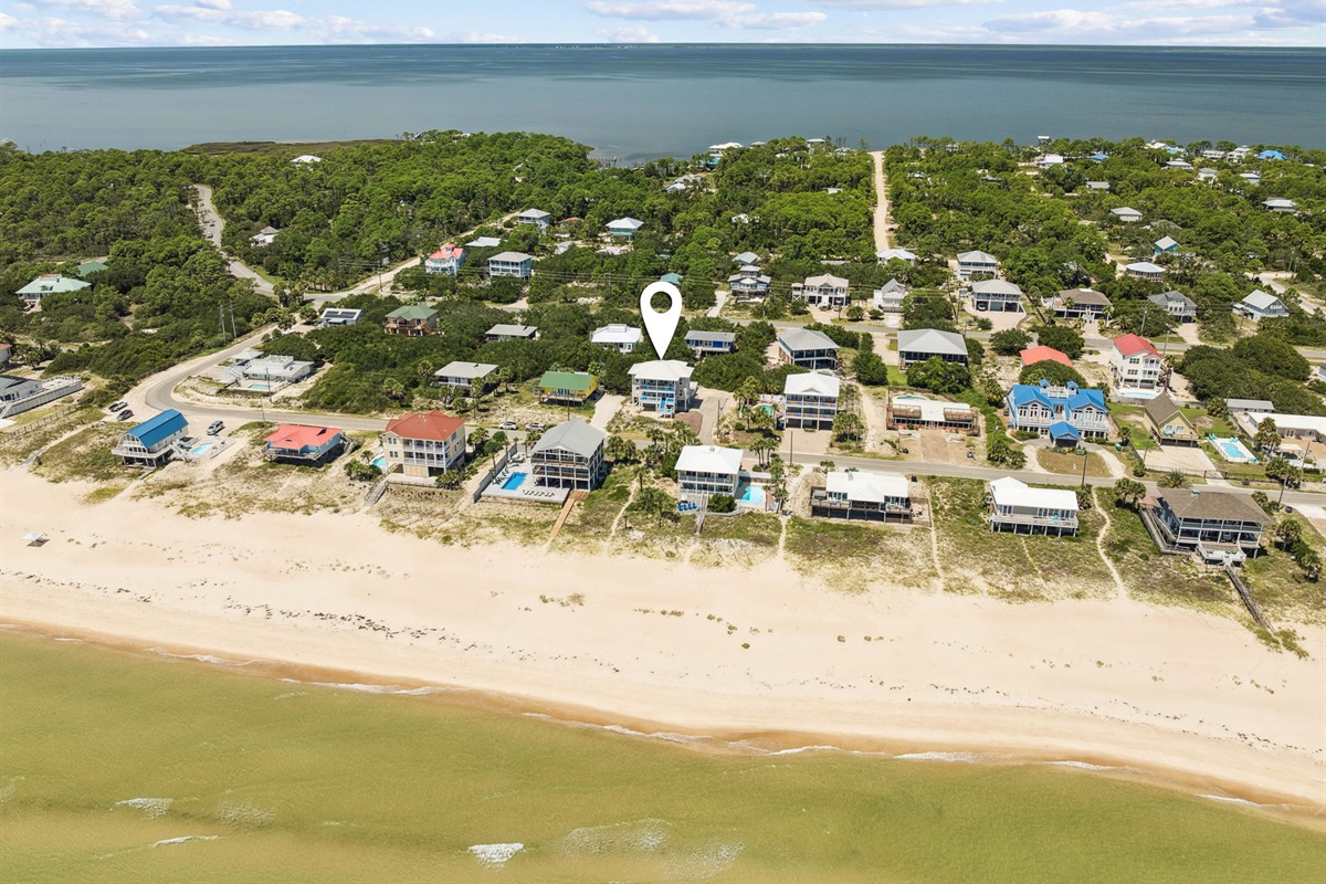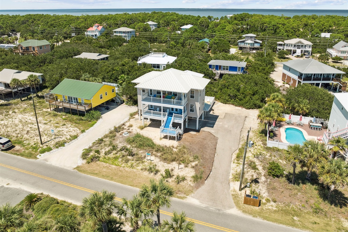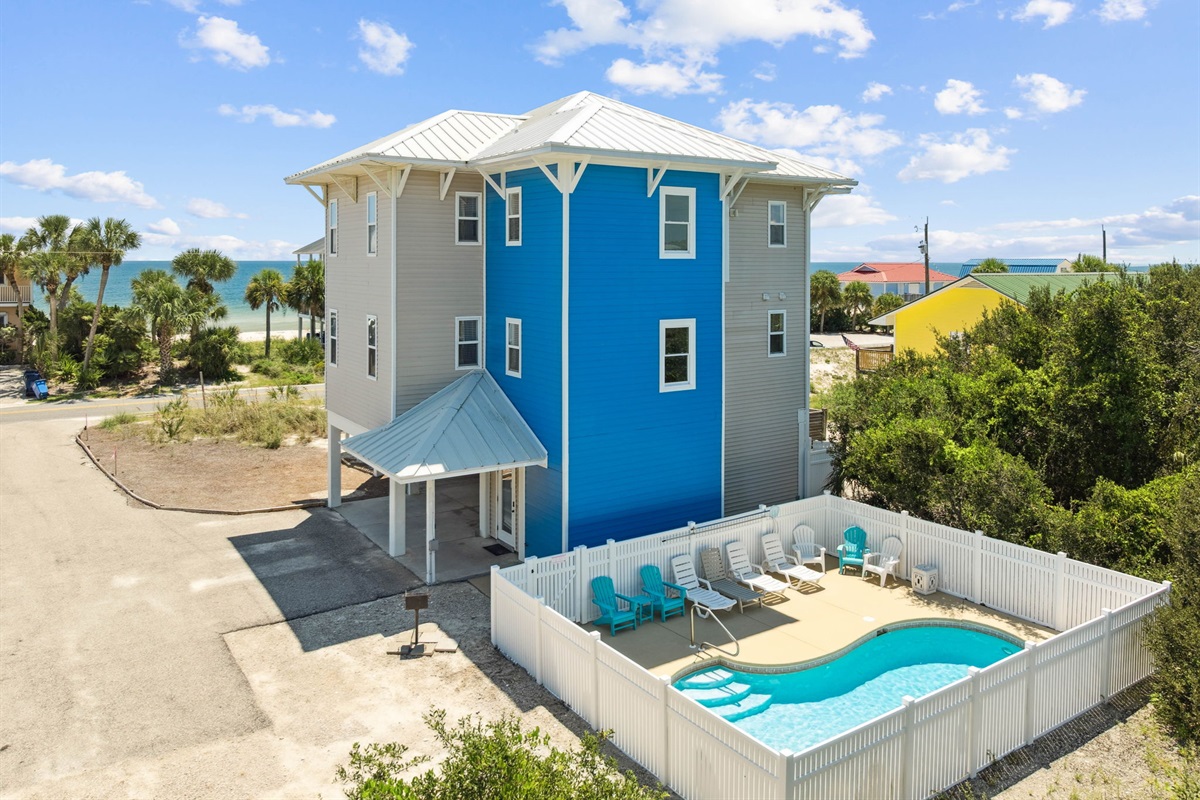 4 Bedrooms • 5 Bathrooms (4 full, 1 half) 5 Baths (4 full, 1 half) • Sleeps 1-12Welcome to our wonderful Blue Bicycle Beach House! Beautifully decorated 4 bedrooms, 4 and a half bath home located steps from sinking your toes in the gorgeous St George Island sand. This home is on the West end of Gorrie Dr and right across the street from the beach. This home boasts a private pool, several covered decks, enclosed hot/cold outdoor shower and fish cleaning station. The covered entry leads to the first floor that features 3 suites. 1 king suite, 1 queen suite, and 1 suite with two queen beds. This floor also includes a large covered deck. The second floor offers an open floor plan living, kitchen, and dining perfect for the family to gather. The airy living room offers comfortable seating and views of the Gulf. The dining table seats 8 with an additional 4 seats at the breakfast bar. The kitchen is well stocked and equipped with black stainless appliances. A half bathroom is located off of the dining room. The master suite is also located on this floor, featuring a king bed and a private bathroom.