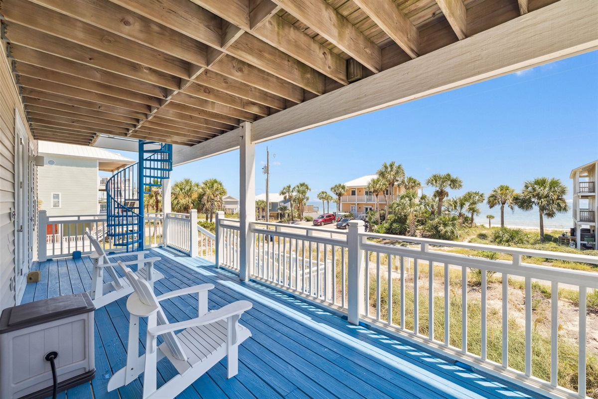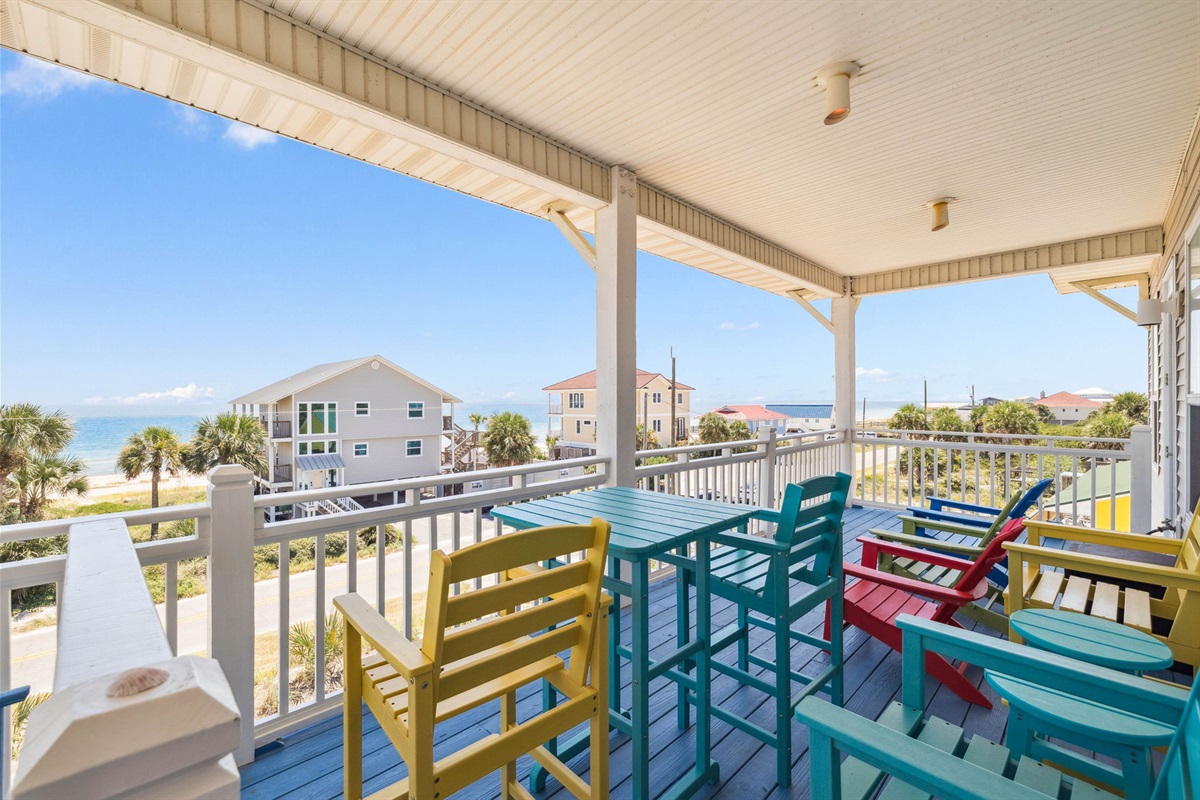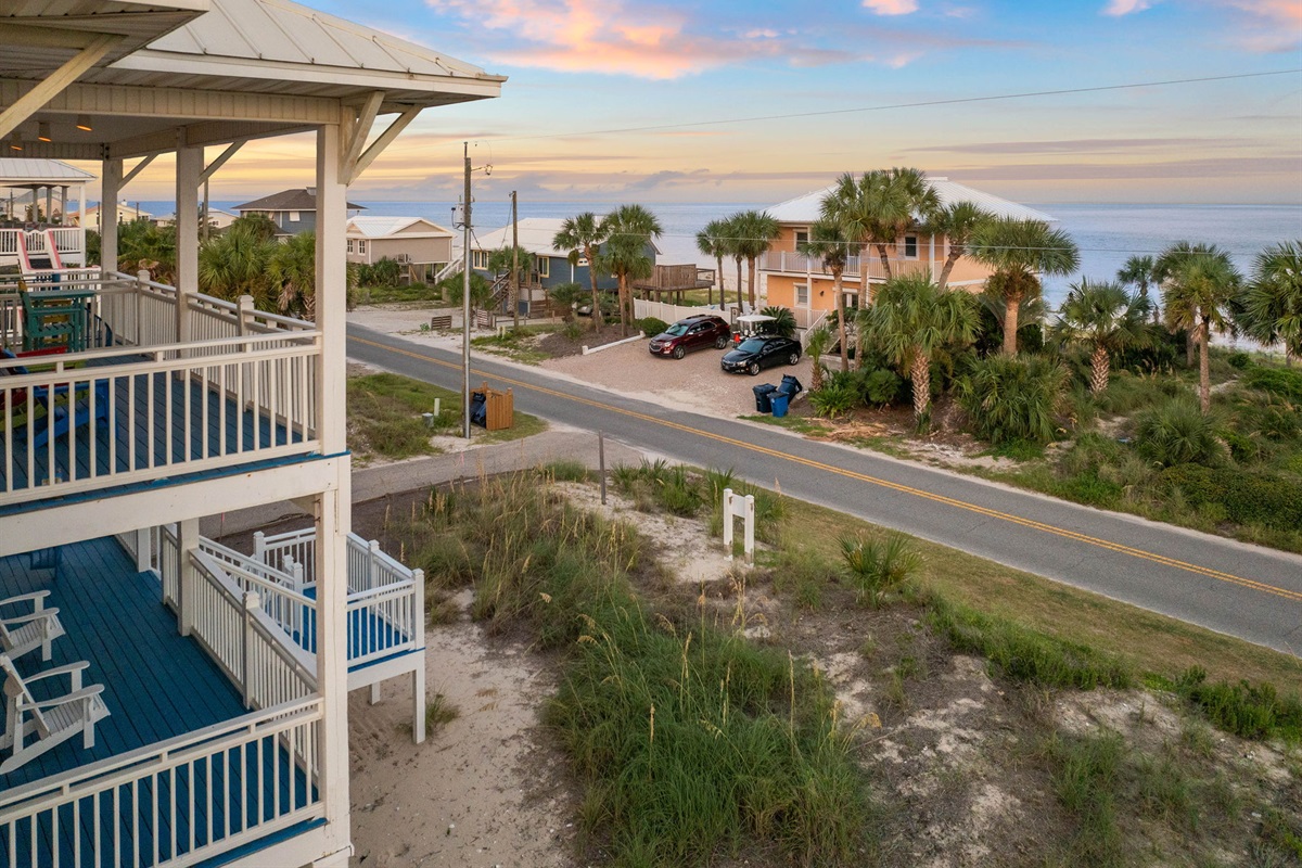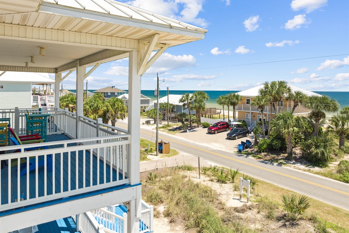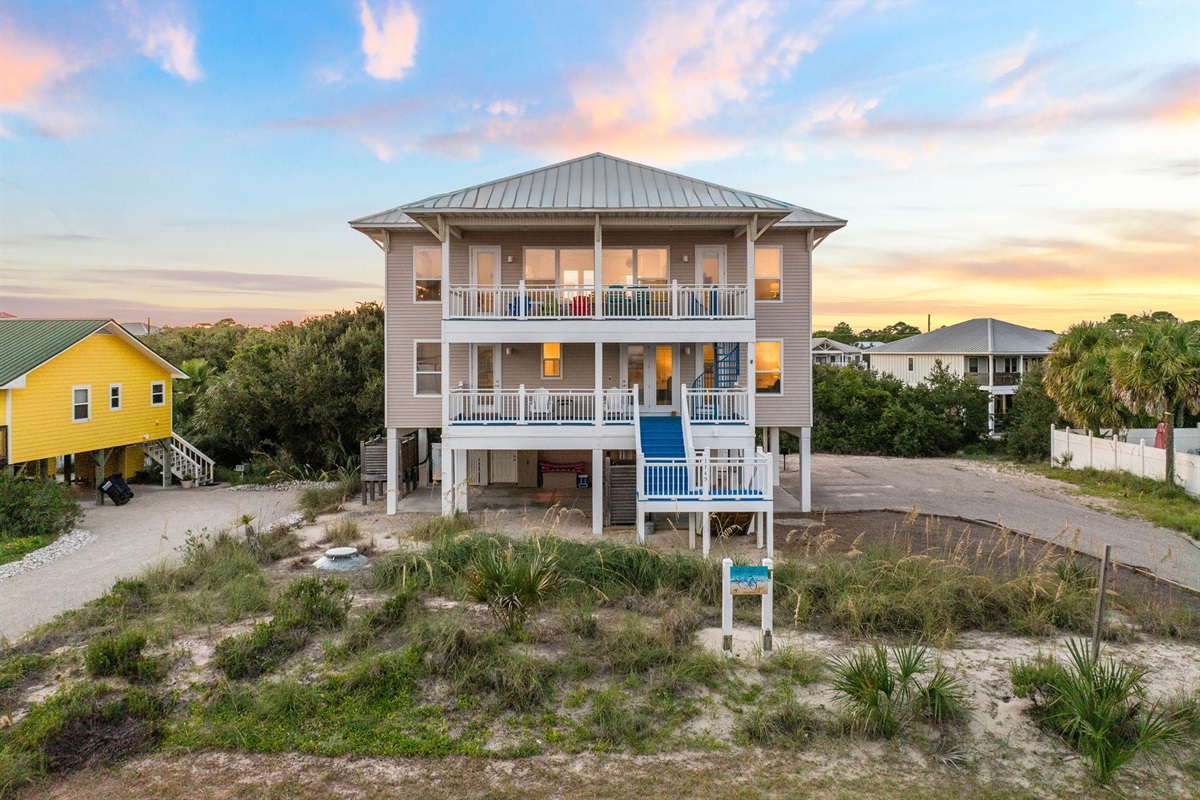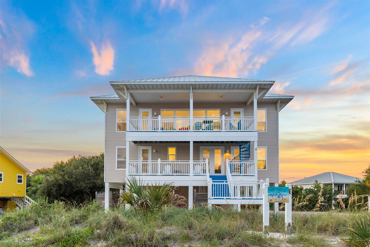 4 Bedrooms • 5 Bathrooms (4 full, 1 half) 5 Baths (4 full, 1 half) • Sleeps 1-12Welcome to our wonderful Blue Bicycle Beach House! Beautifully decorated 4 bedrooms, 4 and a half bath home located steps from sinking your toes in the gorgeous St George Island sand. This home is on the West end of Gorrie Dr and right across the street from the beach. This home boasts a private pool, several covered decks, enclosed hot/cold outdoor shower and fish cleaning station. The covered entry leads to the first floor that features 3 suites. 1 king suite, 1 queen suite, and 1 suite with two queen beds. This floor also includes a large covered deck. The second floor offers an open floor plan living, kitchen, and dining perfect for the family to gather. The airy living room offers comfortable seating and views of the Gulf. The dining table seats 8 with an additional 4 seats at the breakfast bar. The kitchen is well stocked and equipped with black stainless appliances. A half bathroom is located off of the dining room. The master suite is also located on this floor, featuring a king bed and a private bathroom.