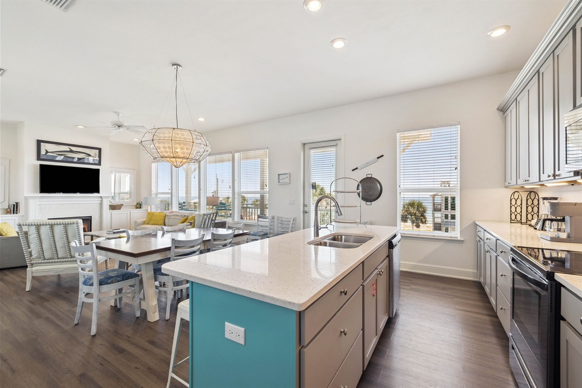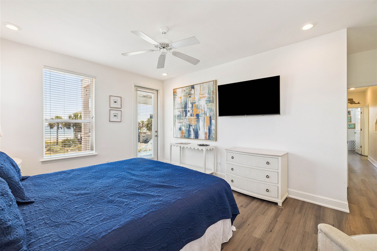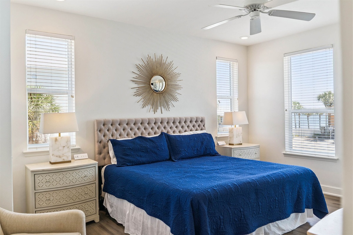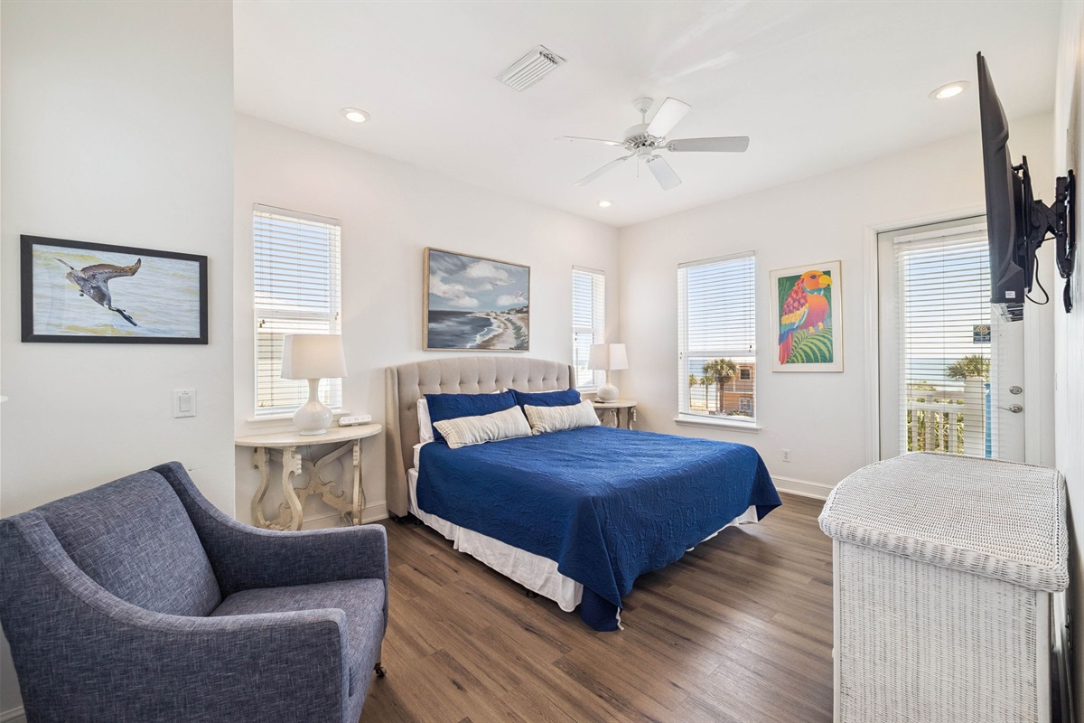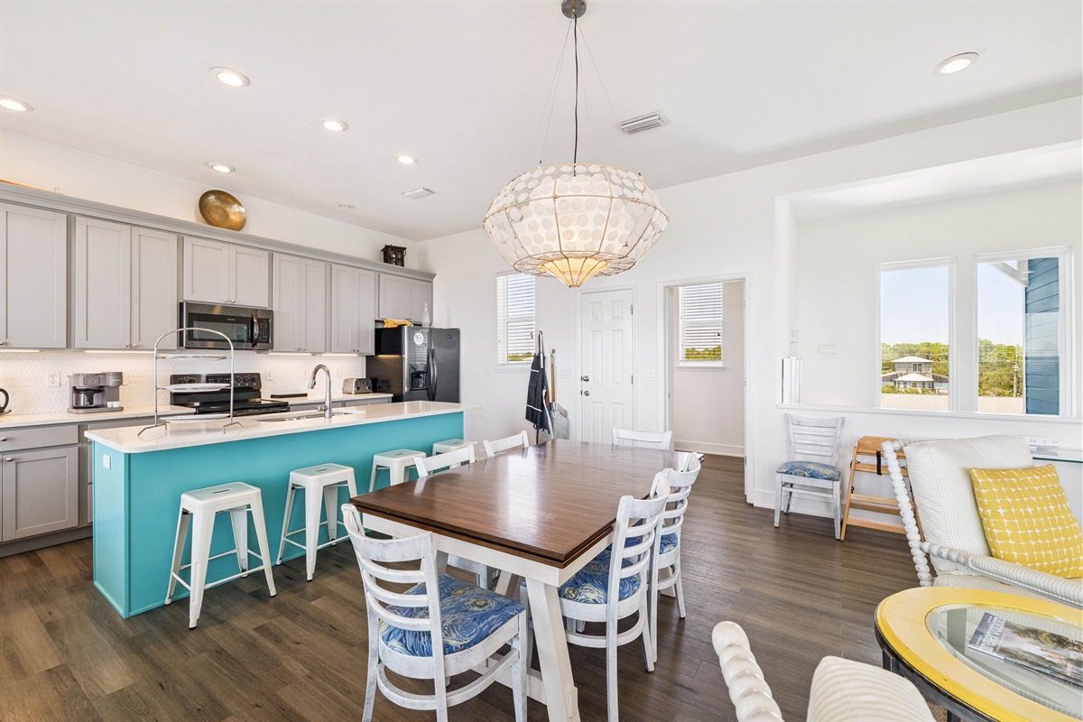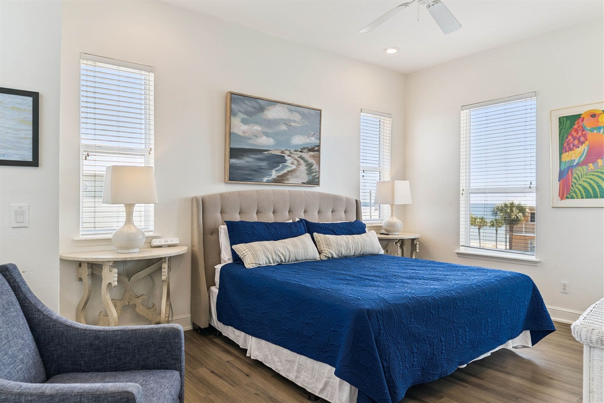 4 Bedrooms • 5 Bathrooms (4 full, 1 half) 5 Baths (4 full, 1 half) • Sleeps 1-12Welcome to our wonderful Blue Bicycle Beach House! Beautifully decorated 4 bedrooms, 4 and a half bath home located steps from sinking your toes in the gorgeous St George Island sand. This home is on the West end of Gorrie Dr and right across the street from the beach. This home boasts a private pool, several covered decks, enclosed hot/cold outdoor shower and fish cleaning station. The covered entry leads to the first floor that features 3 suites. 1 king suite, 1 queen suite, and 1 suite with two queen beds. This floor also includes a large covered deck. The second floor offers an open floor plan living, kitchen, and dining perfect for the family to gather. The airy living room offers comfortable seating and views of the Gulf. The dining table seats 8 with an additional 4 seats at the breakfast bar. The kitchen is well stocked and equipped with black stainless appliances. A half bathroom is located off of the dining room. The master suite is also located on this floor, featuring a king bed and a private bathroom.