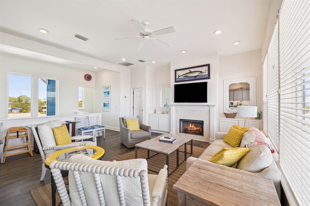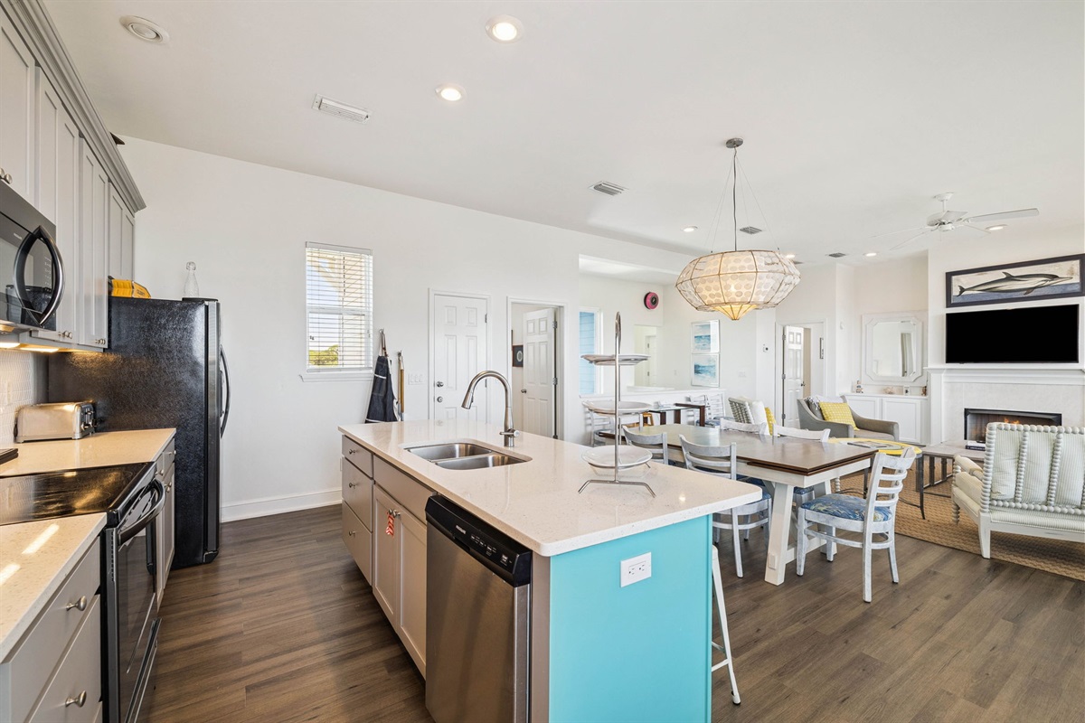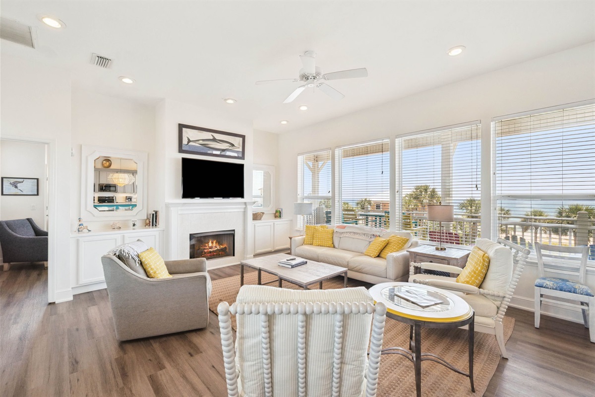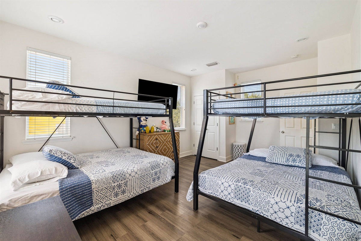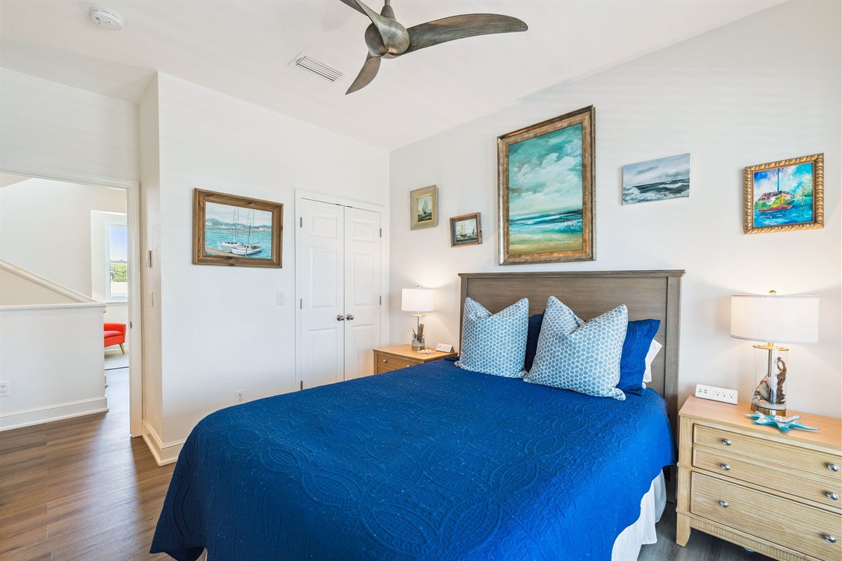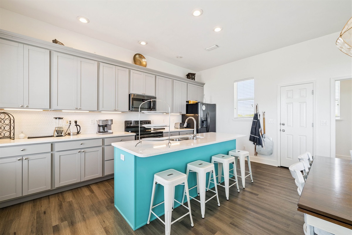 4 Bedrooms • 5 Bathrooms (4 full, 1 half) 5 Baths (4 full, 1 half) • Sleeps 1-12Welcome to our wonderful Blue Bicycle Beach House! Beautifully decorated 4 bedrooms, 4 and a half bath home located steps from sinking your toes in the gorgeous St George Island sand. This home is on the West end of Gorrie Dr and right across the street from the beach. This home boasts a private pool, several covered decks, enclosed hot/cold outdoor shower and fish cleaning station. The covered entry leads to the first floor that features 3 suites. 1 king suite, 1 queen suite, and 1 suite with two queen beds. This floor also includes a large covered deck. The second floor offers an open floor plan living, kitchen, and dining perfect for the family to gather. The airy living room offers comfortable seating and views of the Gulf. The dining table seats 8 with an additional 4 seats at the breakfast bar. The kitchen is well stocked and equipped with black stainless appliances. A half bathroom is located off of the dining room. The master suite is also located on this floor, featuring a king bed and a private bathroom.